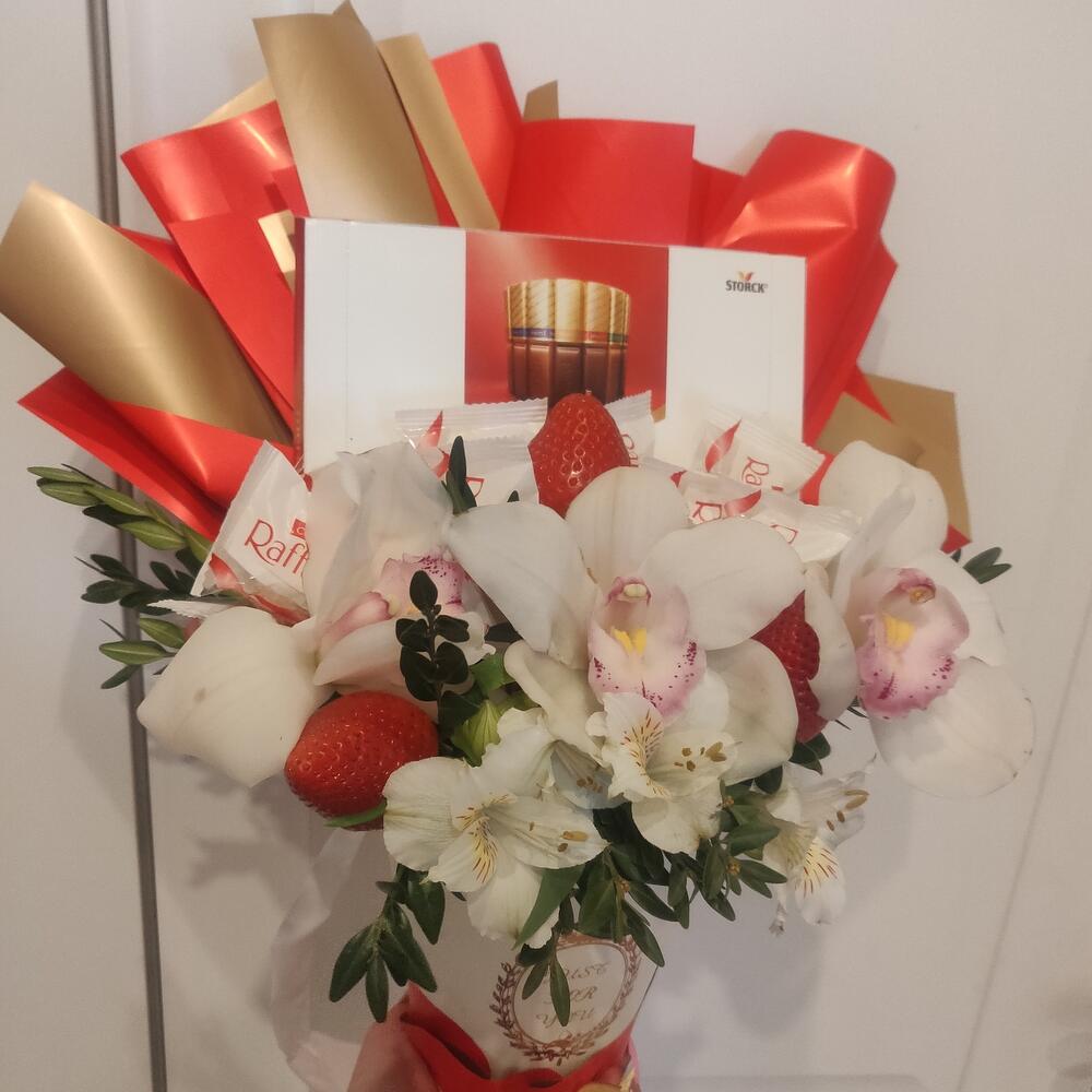 Альстромерия – 3 шт.Клубника – 250 гр.орхидея – 3 шт.Упаковка дизайнерская – 1 шт.Конфеты мерси 250 гр – 1 шт.раффаэлло 150 гр – 1 шт.