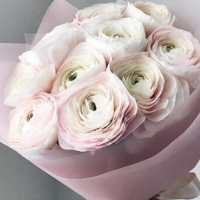 Ранункулюс (белый) – 11 шт.Дизайнерская упаковка – 2 шт.Лента атласная – 1 шт.
