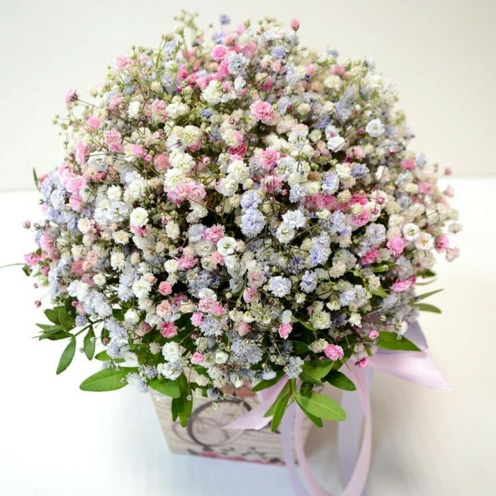 “Сиреневый туман” – композиция из гипсофилы в шляпной коробке