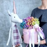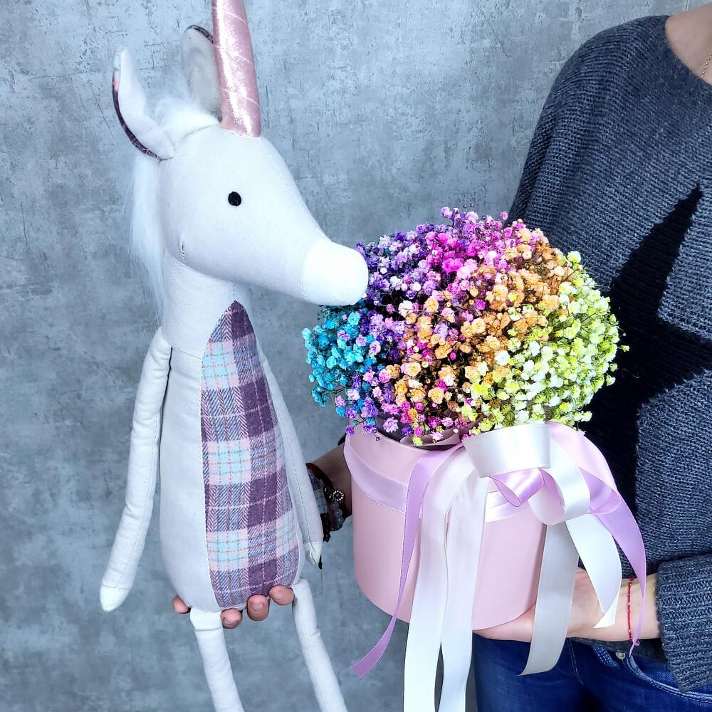 Гипсофила – 5 шт.Хлопок – 3 шт.Шляпная коробка – 1 шт.мишка единорог – 1 шт.