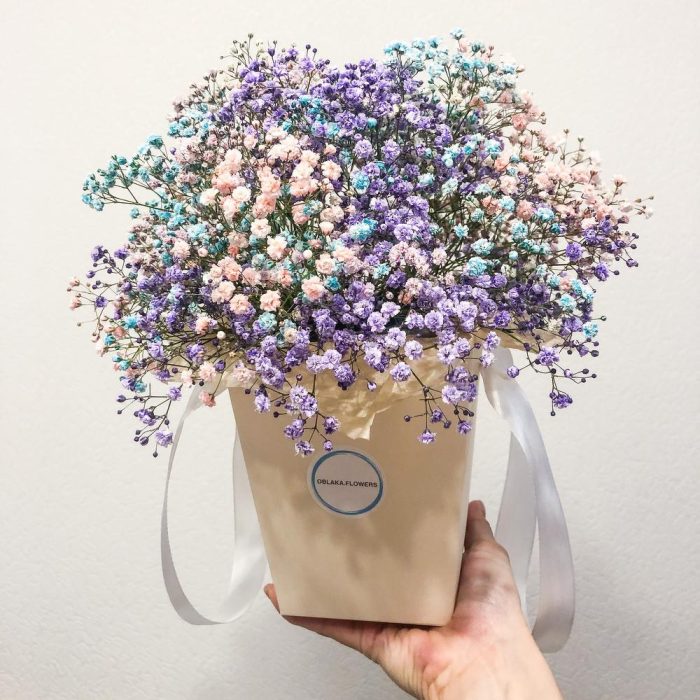 Гипсофила – 5 шт.Сумочка с ручками из плотного картона ламинированого – 1 шт.Губка флористическая – 1 шт.