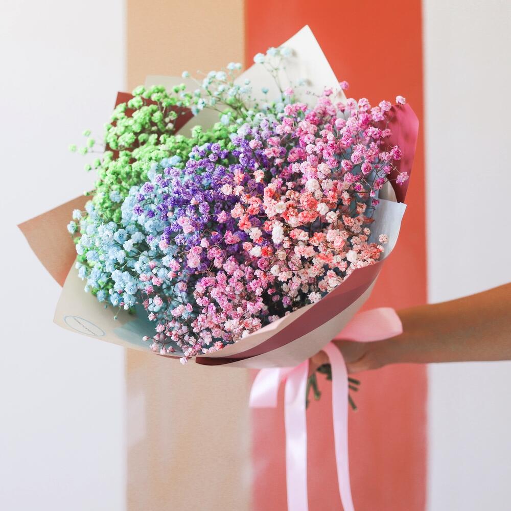 гипсофила цветная микс – 7 шт.Упаковка корейская пленка – 2 шт.Лента атласная – 1 шт.инструкция по уходу за цветами – 1 шт.упаковка транспортировочная – 1 шт.