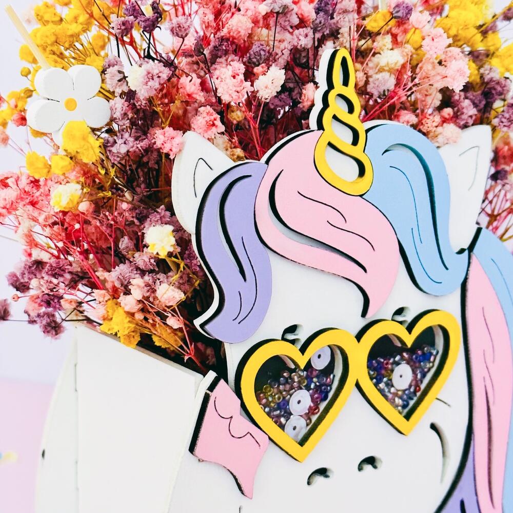 гипсофила стабилизированная розовая – 1 шт.гипсофила стабилизированная сиреневая – 1 шт.гипсофила стабилизированная желтая – 1 шт.деревянное кашпо единорог – 1 шт.