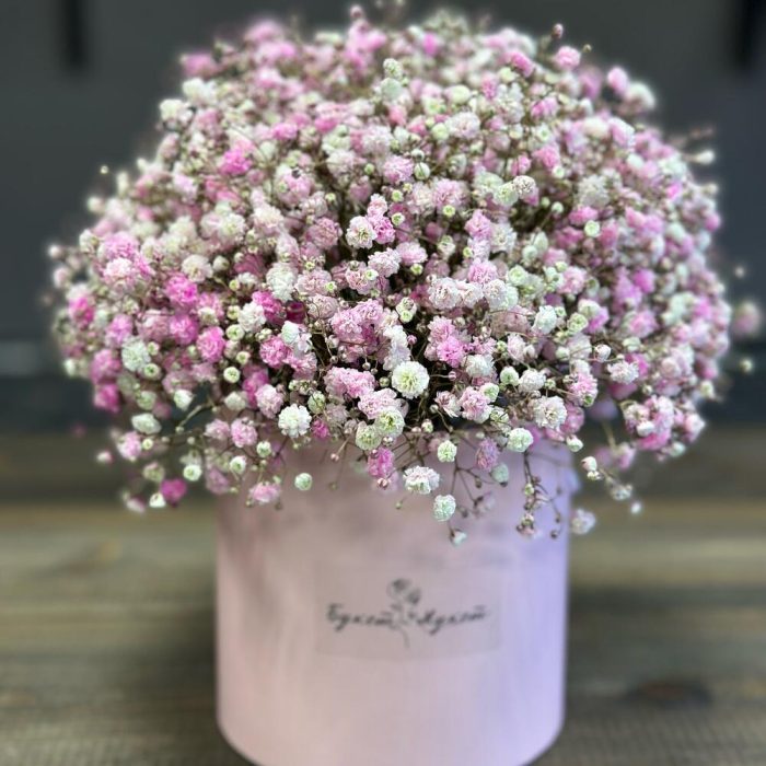 “Сиреневый туман” – композиция из гипсофилы в шляпной коробке