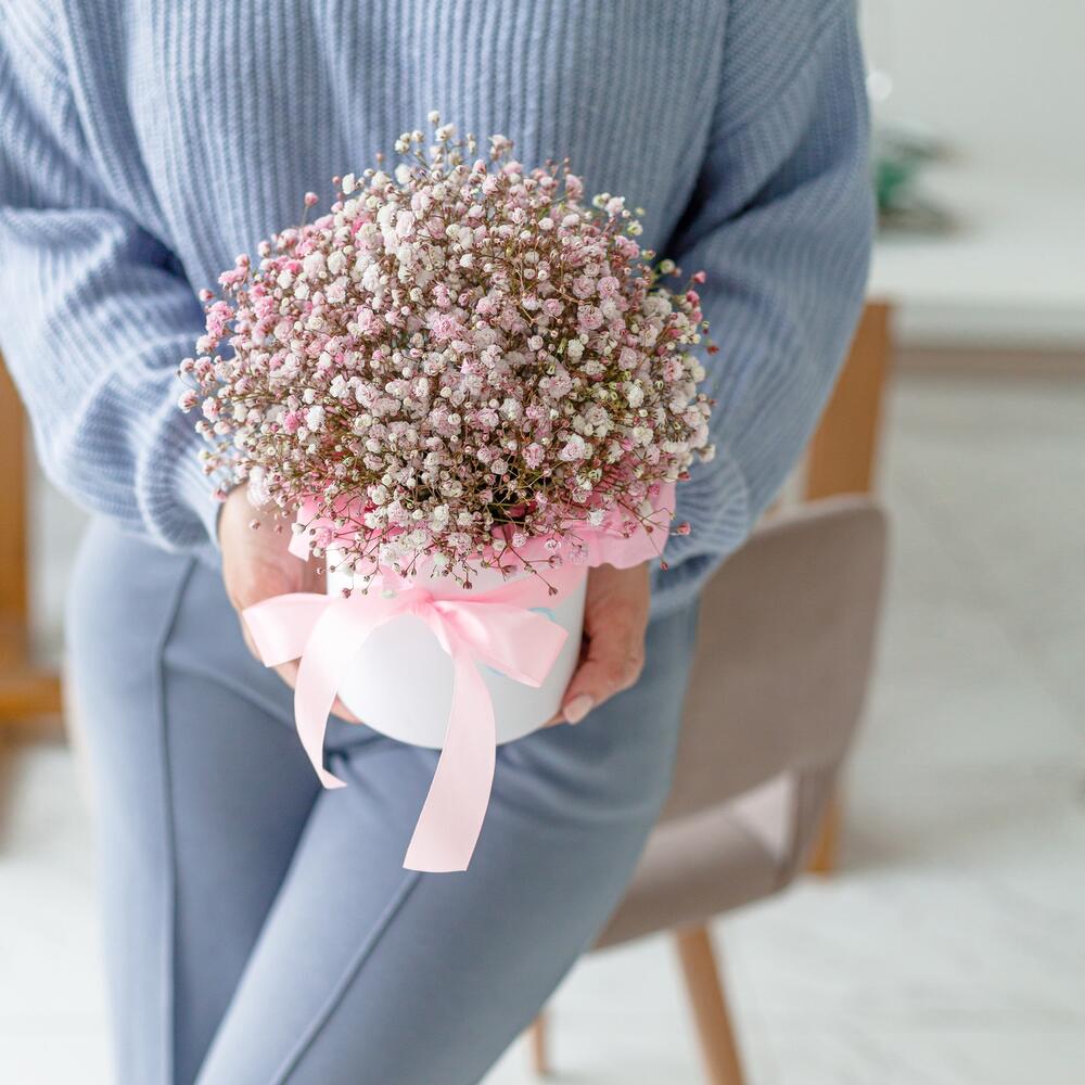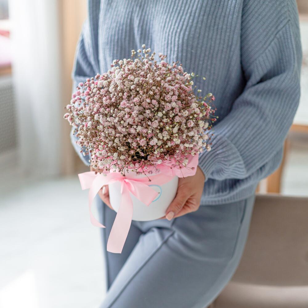 гипсофила цветная – 5 шт.Коробка шляпная – 1 шт.Тишью – 4 шт.Оазис флористический – 1 шт.Лента атласная – 1 шт.Упаковка транспортировочная пленка – 1 шт.