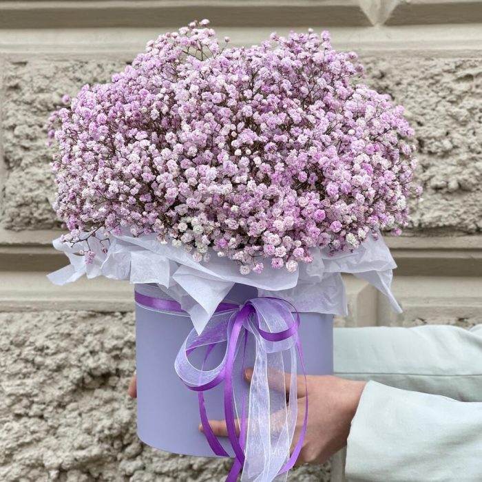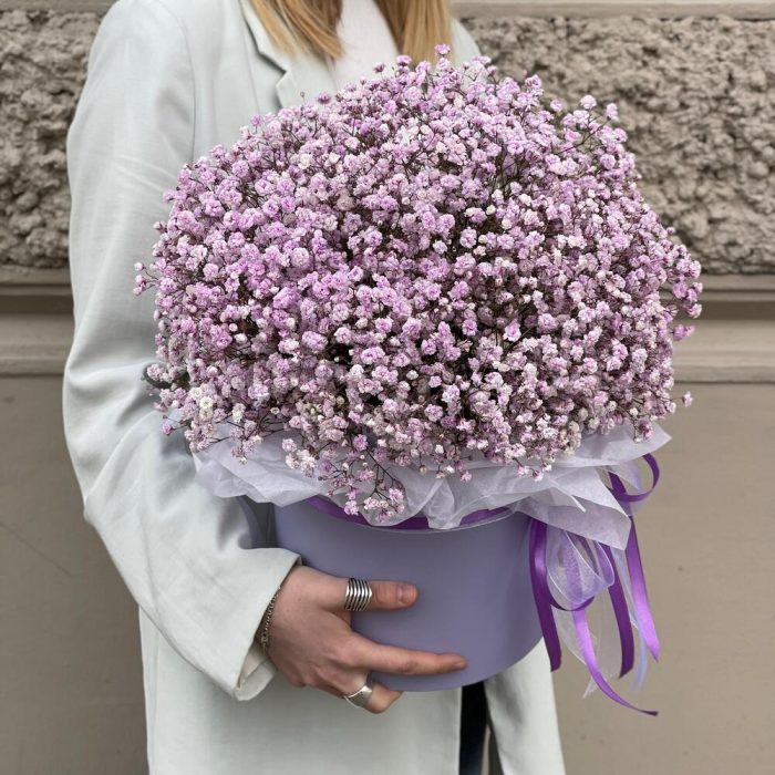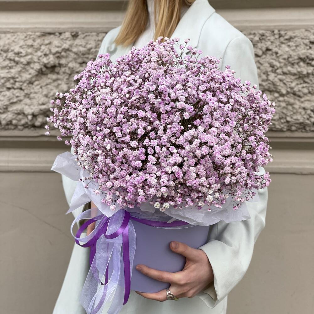 Гипсофила – 9 шт.Лента – 2 шт.Тишью – 1 шт.Коробка шляпная – 1 шт.Оазис флористический – 1 шт.
