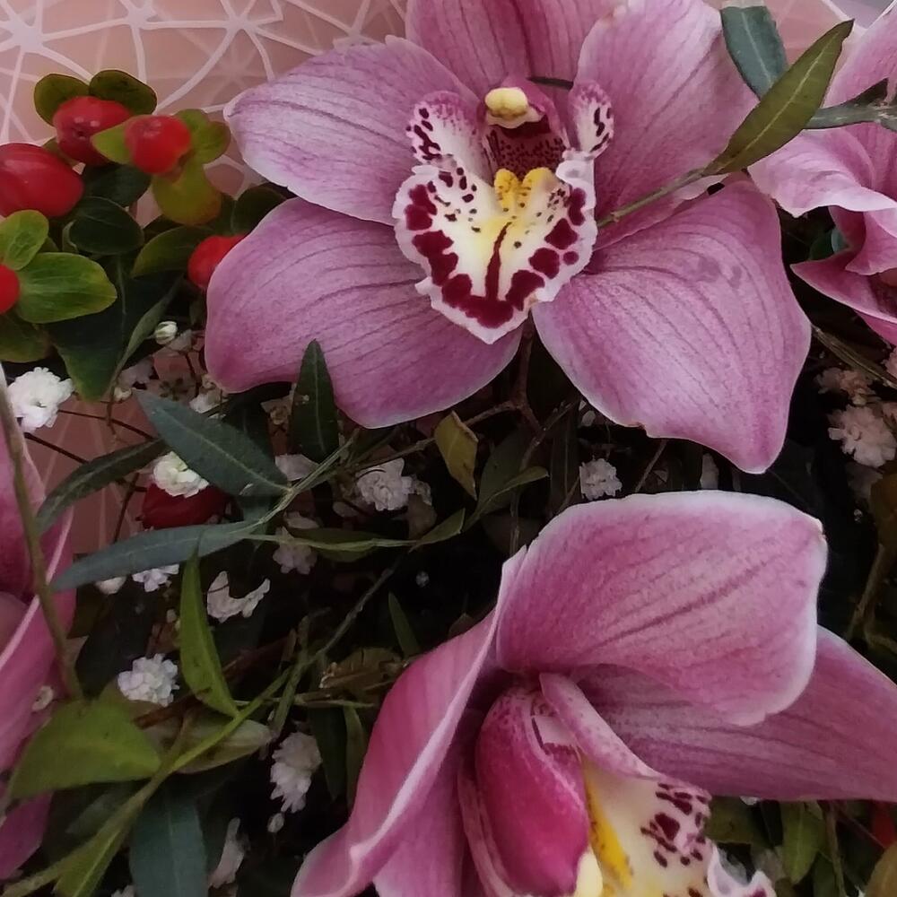 Орхидея Цимбидиум розовая – 9 шт.Хиперикум красный – 5 шт.гипсофила белая – 2 шт.фисташка зелень – 15 шт.Упаковка дизайнерская – 3 шт.