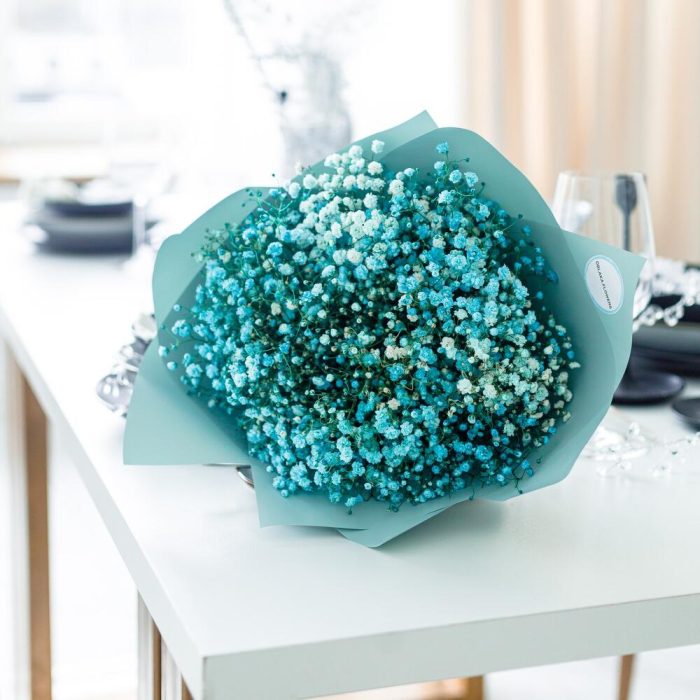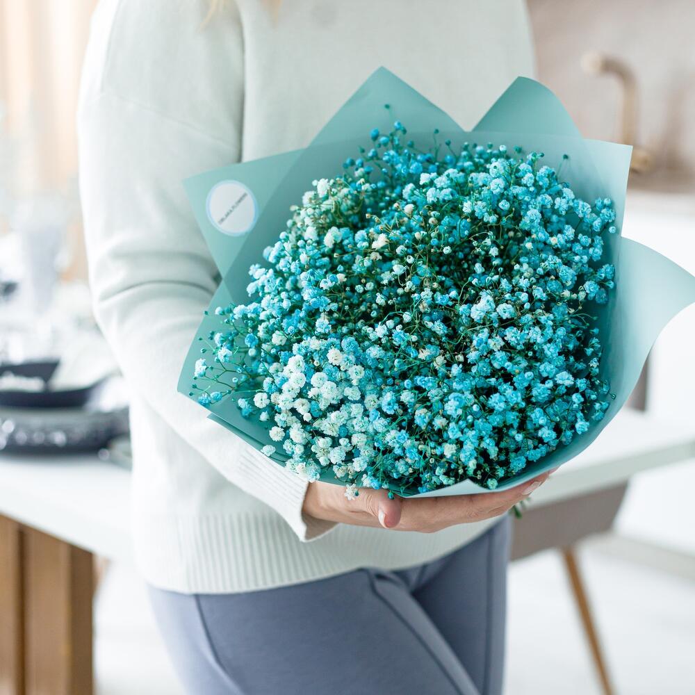 гипсофила цветная – 7 шт.пленка корейская дизайнерская – 2 шт.Лента атласная – 1 шт.Упаковка транспортировочная пленка – 1 шт.инструкция по уходу за цветами – 1 шт.