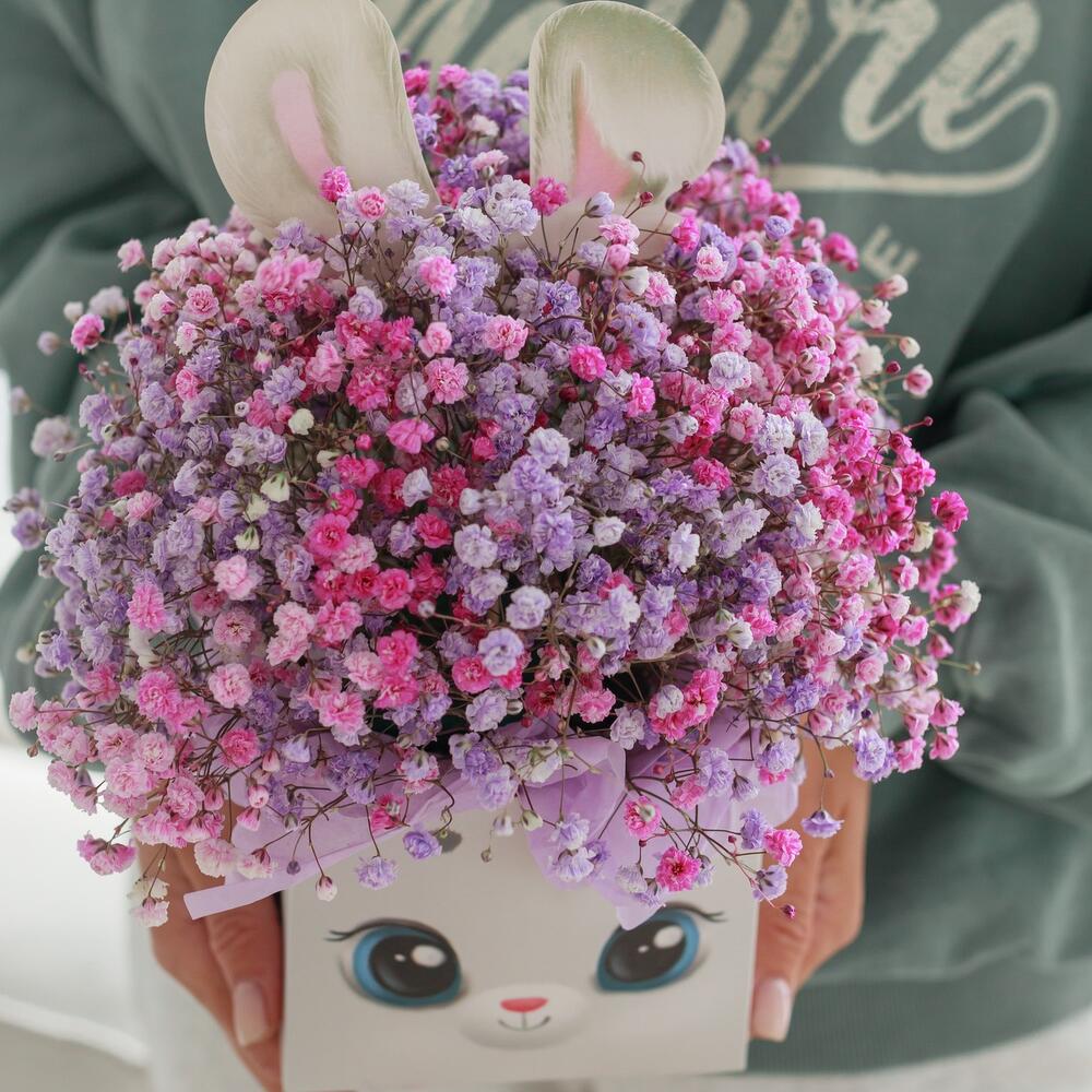 гипсофила цветная – 5 шт.коробка зайка – 1 шт.Тишью – 4 шт.Оазис флористический – 1 шт.упаковка транспортировочная – 1 шт.инструкция по уходу за цветами – 1 шт.