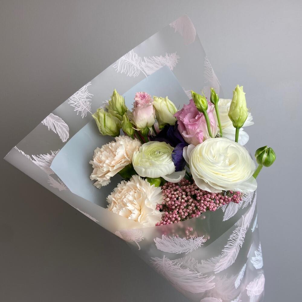 Ранункулюс – 3 шт.Гвоздика одноголовая – 3 шт.Анемон – 1 шт.Лизиантус – 1 шт.озатомнус – 2 шт.Упаковка дизайнерская – 1 шт.