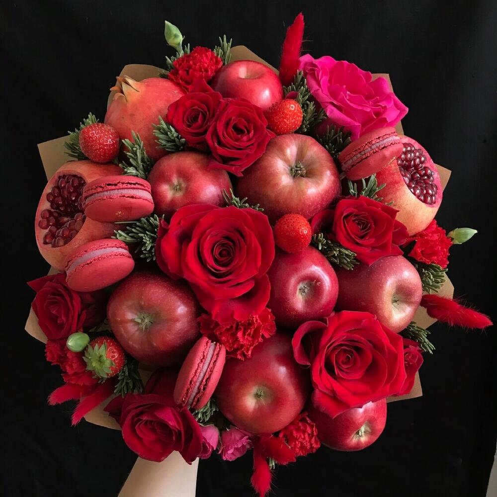 яблоки – 8 шт.гранаты – 3 шт.розы – 6 шт.Гвоздика – 5 шт.Клубника – 5 шт.Пирожные макарон – 4 шт.зелень фисташки – 3 шт.Лагурус – 4 шт.