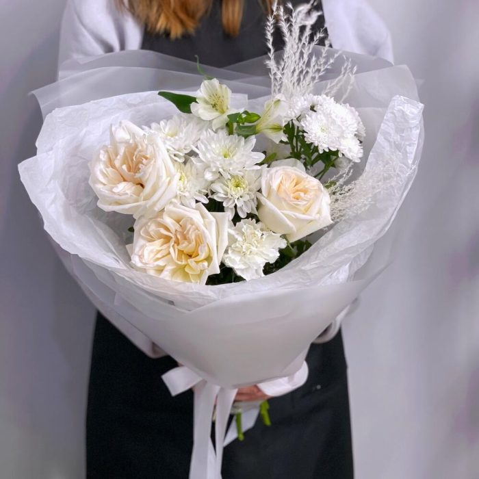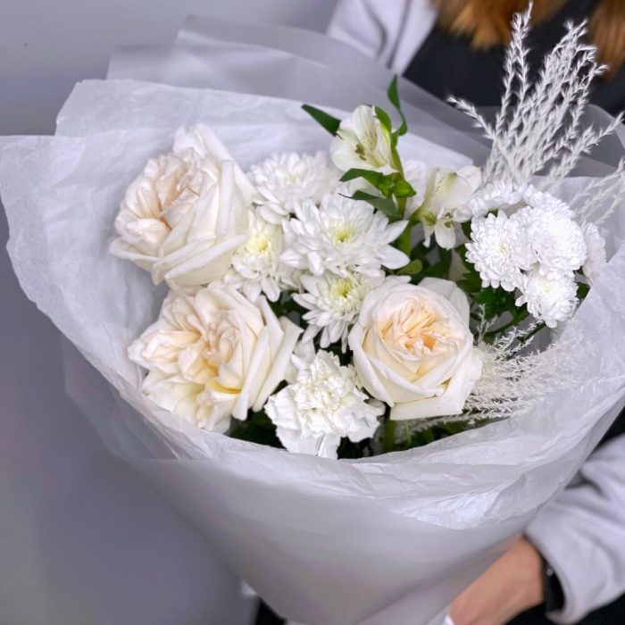 пионовидные розы – 3 шт.Хризантема кустовая – 1 шт.Гвоздика – 1 шт.Альстромерия – 1 шт.Сухоцветы – 2 шт.Фисташка – 3 шт.Упаковка дизайнерская – 1 шт.