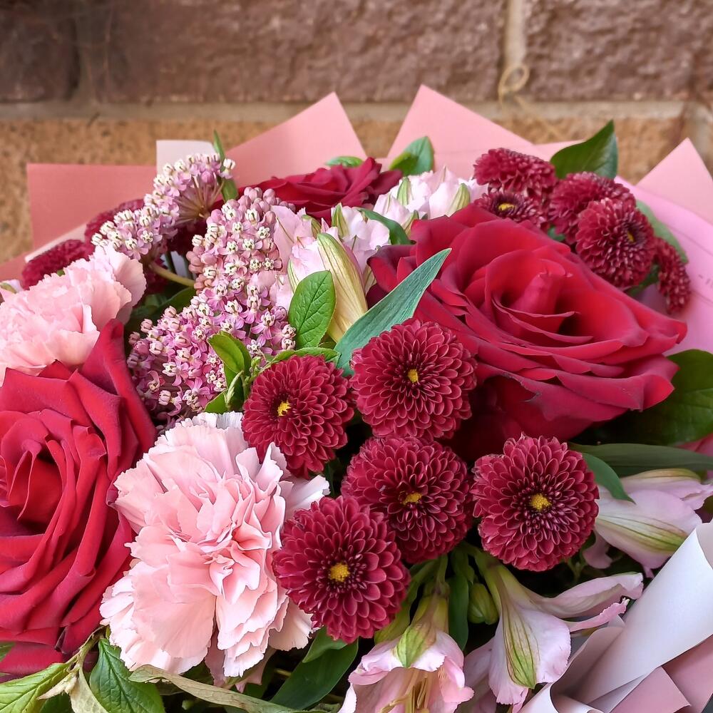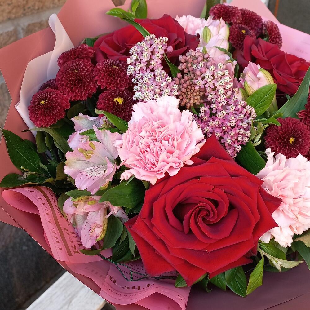 Альстромерия – 3 шт.Лента – 1 шт.Роза Эквадор – 3 шт.Диантус – 3 шт.Сантини – 3 шт.Асклепиас – 1 шт.Пленка дизайнерская – 3 шт.зелень декоративная – 7 шт.каркас ручной работы – 1 шт.