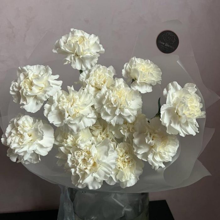 белые гвоздики – 15 шт.декоративная упаковка – 1 шт.Атласная лента – 1 шт.