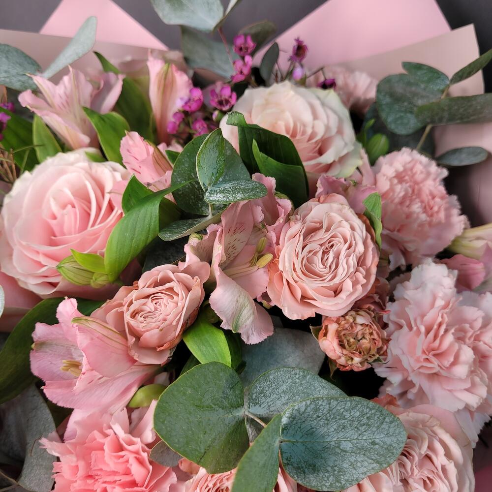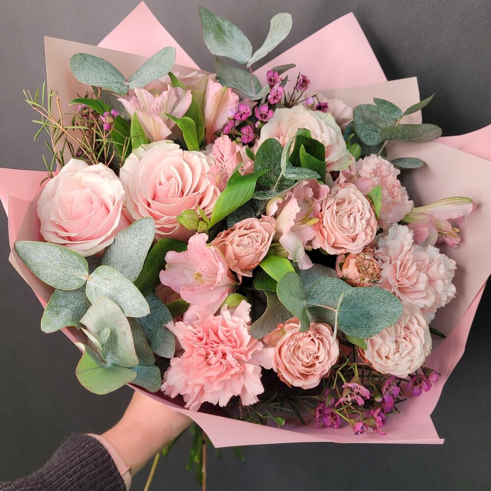 Альстромерия – 3 шт.Эвкалипт – 1 шт.Роза Эквадор – 4 шт.Лента атласная – 1 шт.Диантус – 5 шт.Хамелациум – 1 шт.Роза кустовая пионовидная – 1 шт.Упаковка дизайнерская – 1 шт.