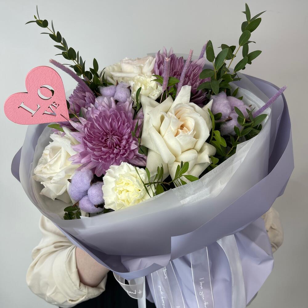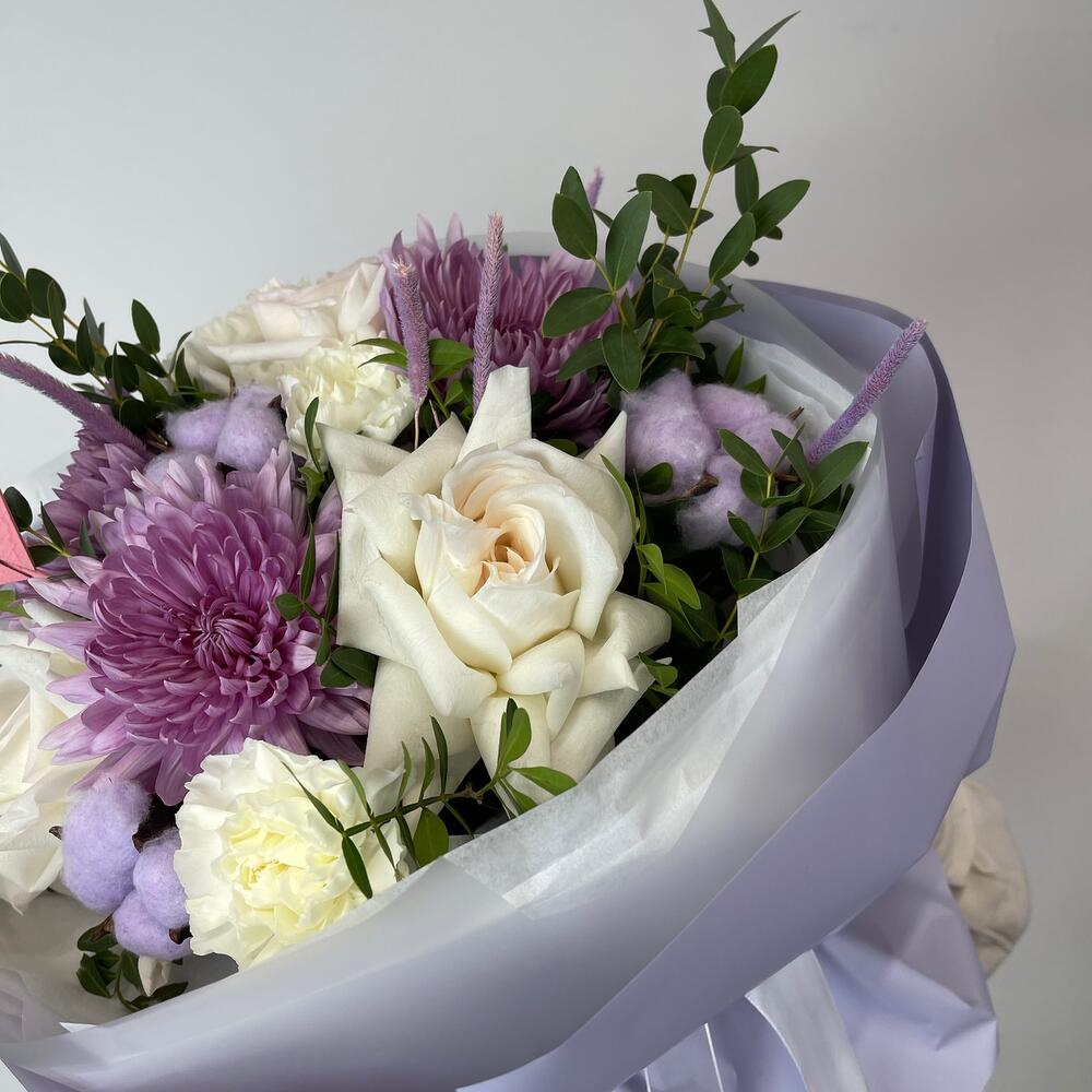Хризантема – 3 шт.white o’hara – 3 шт.Хлопок – 3 шт.Диантус – 3 шт.Фисташка пучок – 1 шт.Эвкалипт – 2 шт.Пленка матовая – 4 шт.Тишью – 6 шт.Лента – 2 шт.