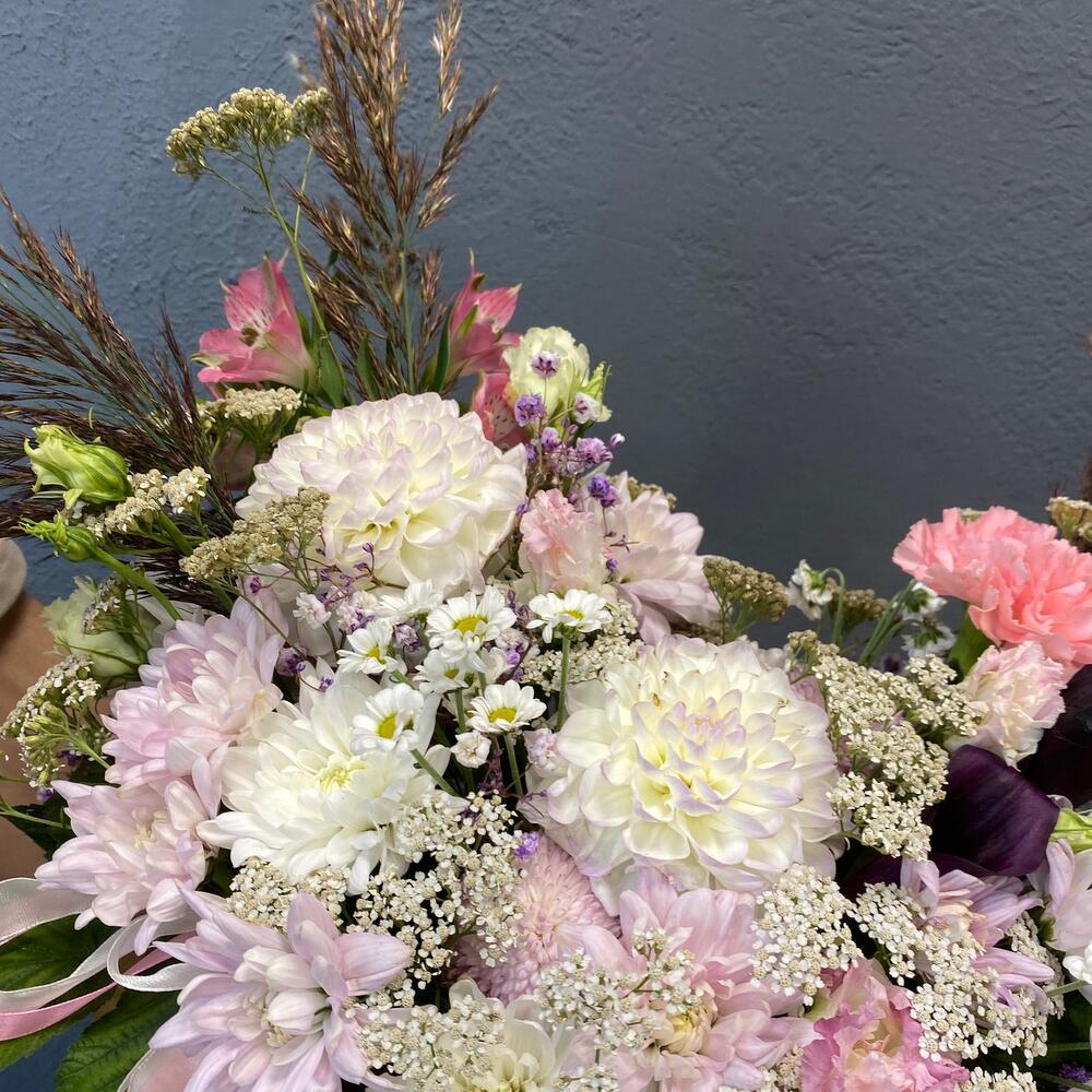 магнум – 2 шт.каллы – 2 шт.Альстромерия – 1 шт.Хризантема – 7 шт.Эустома – 2 шт.Тысячелистник – 5 шт.пампасная трава – 5 шт.Фрезия – 2 шт.Диантус сортовой – 1 шт.Сантини – 1 шт.Коробка шляпная – 1 шт.Оазис – 2 шт.Лента атласная – 2 шт.