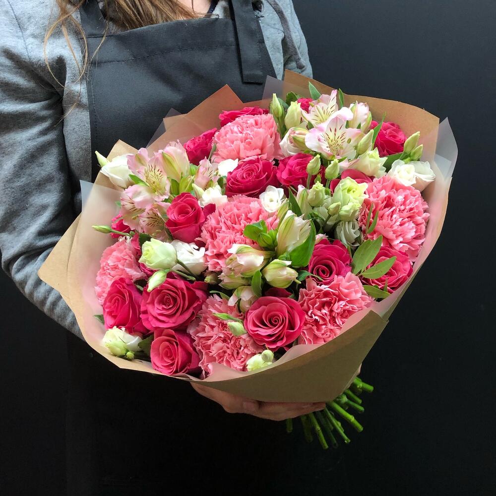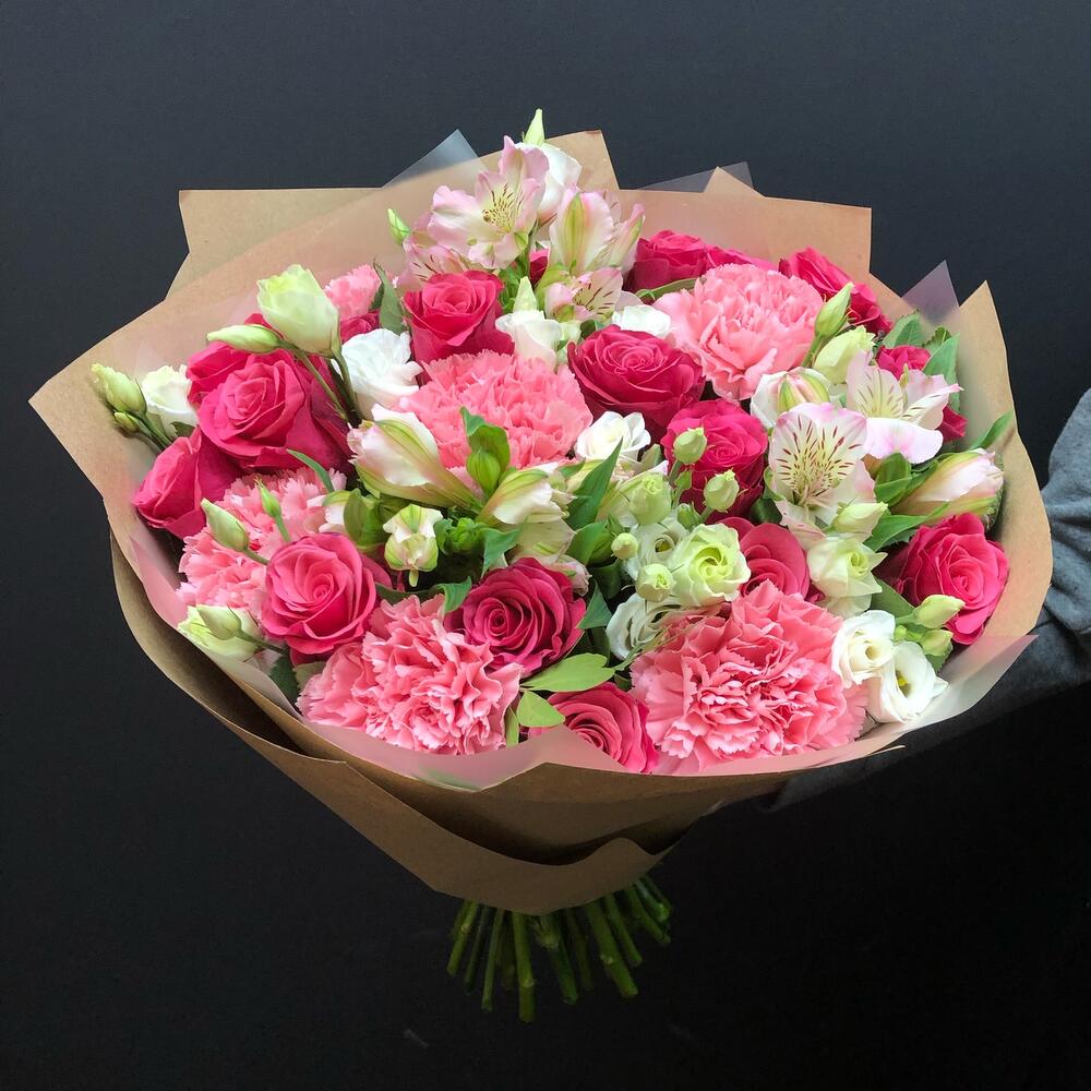 Категории: АльстромерииРозы, Гвоздики, Лизиантусы