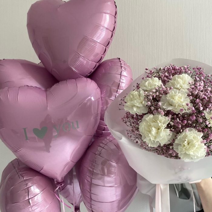 В подарочный сет входит:Фонтан из 7 фольгированных сердец с надписьюБукет из розовой гипсофилы и белых диантусов
