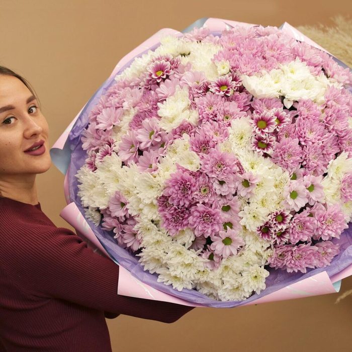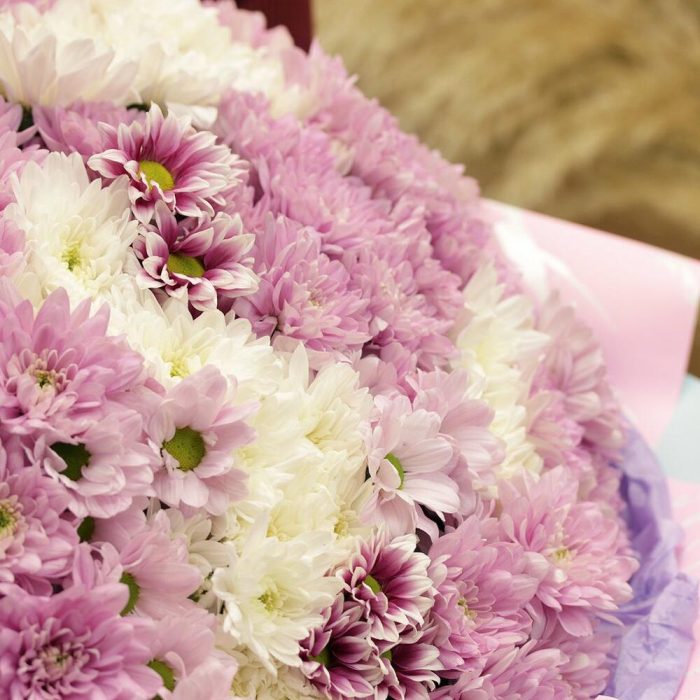 Букет из 51 кустовой хризантемы нежный микс в стильной упаковке