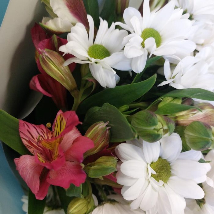 Хризантема кустовая – 4 шт.Альстромерия – 5 шт.Упаковка дизайнерская – 3 шт.Лента атласная – 2 шт.