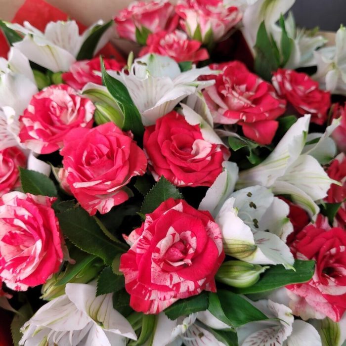 Роза кустовая – 3 шт.Альстромерия Микс Европа – 5 шт.Упаковка дизайнерская – 3 шт.