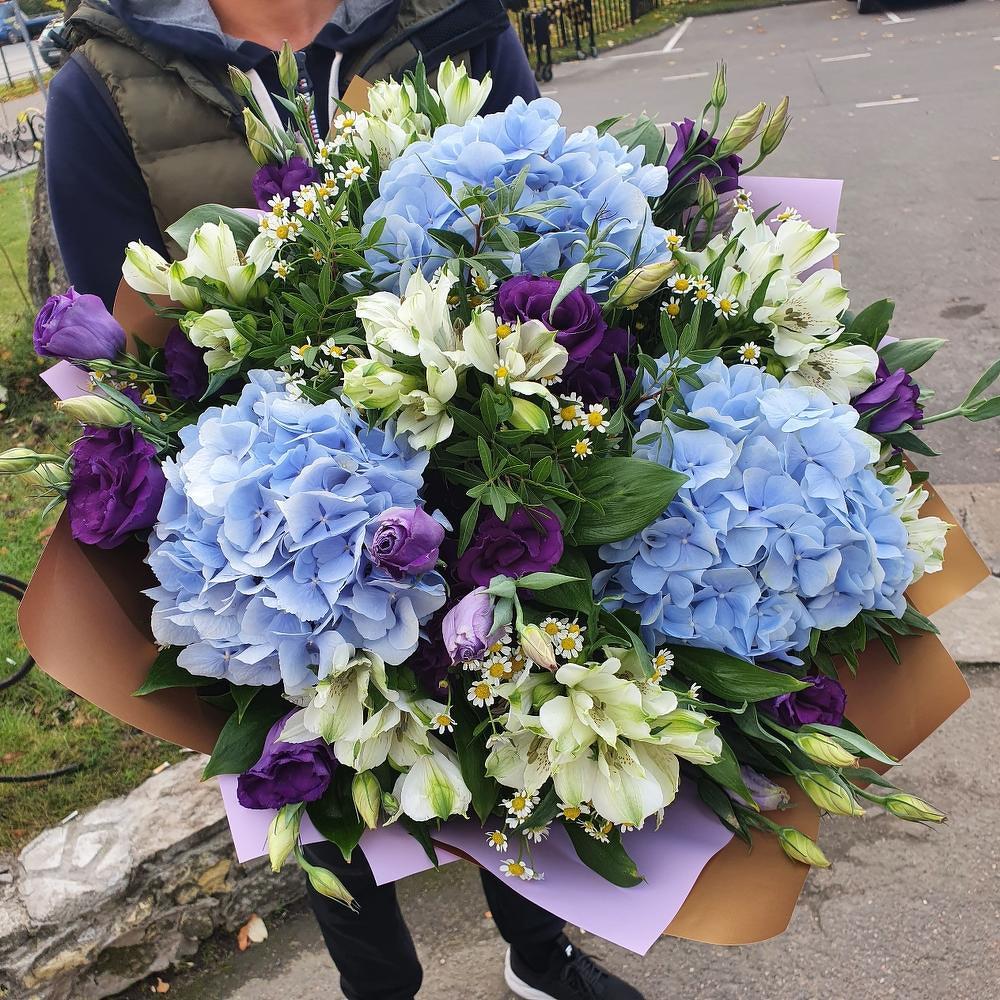 Альстромерия – 7 шт.Гортензия – 3 шт.Лизиантус – 9 шт.Рускус – 10 шт.Матрикария – 7 шт.Фисташка – 10 шт.Упаковка дизайнерская – 3 шт.