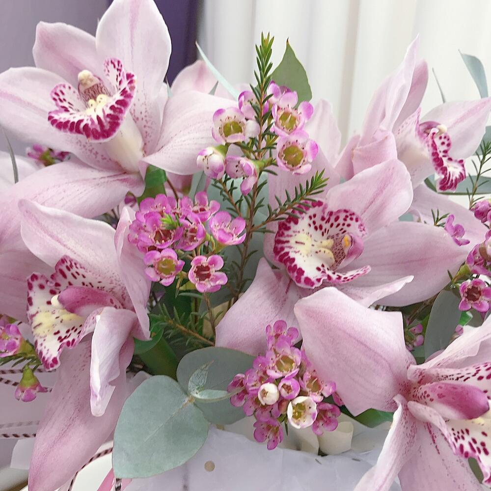 Орхидея Цимбидиум – 11 шт.Хамелациум – 3 шт.Эвкалипт – 3 шт.Лента атласная – 2 шт.