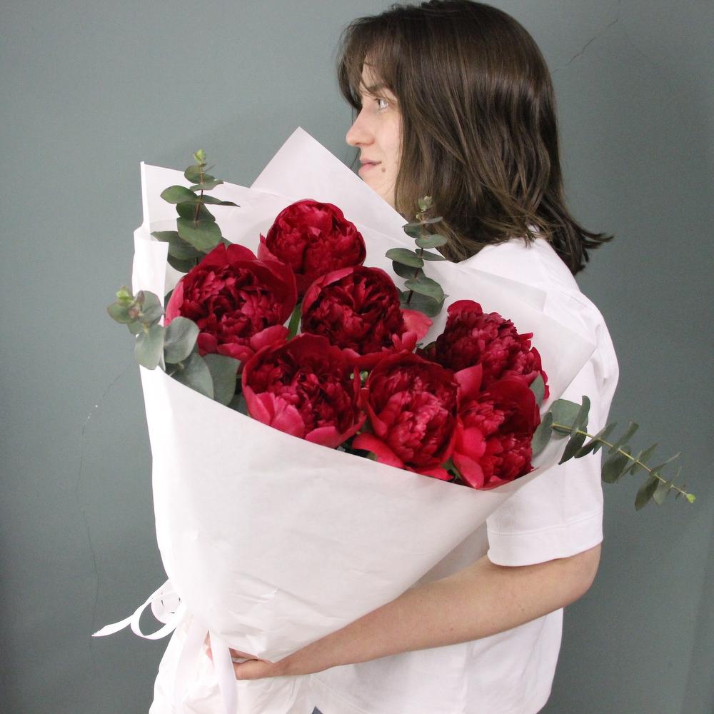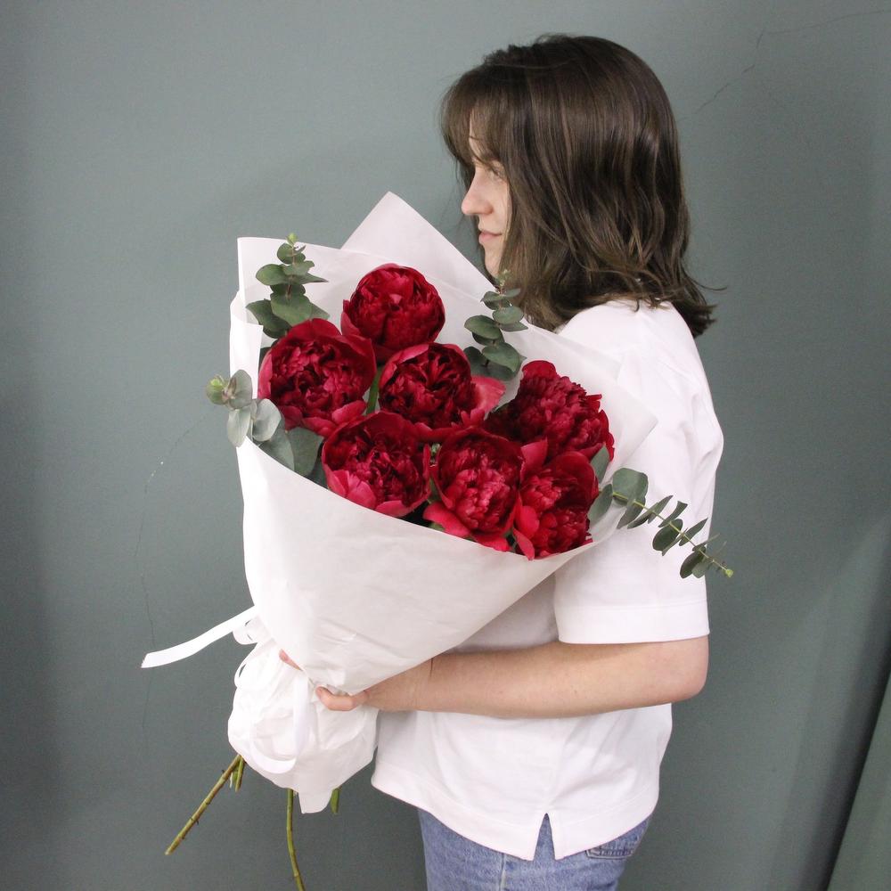 Алый - букет из пионов и эвкалипта