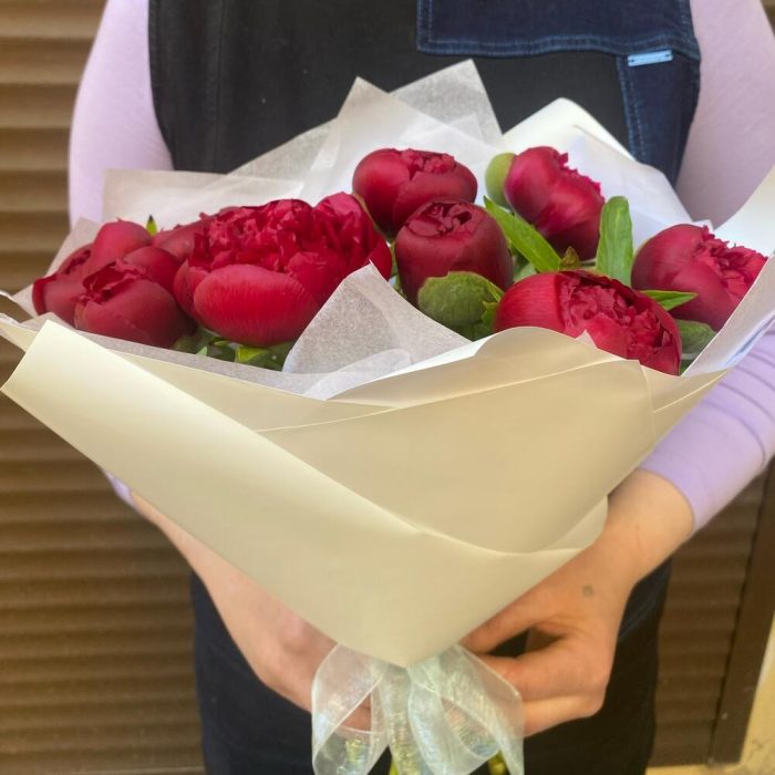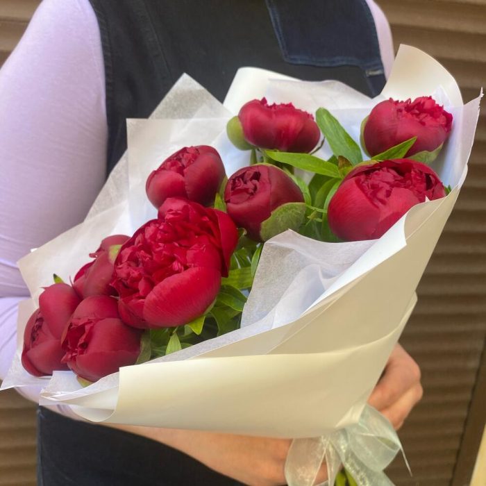 Пион – 9 шт.Лента атласная – 1 шт.Упаковка дизайнерская – 2 шт.Тишью белое – 2 шт.