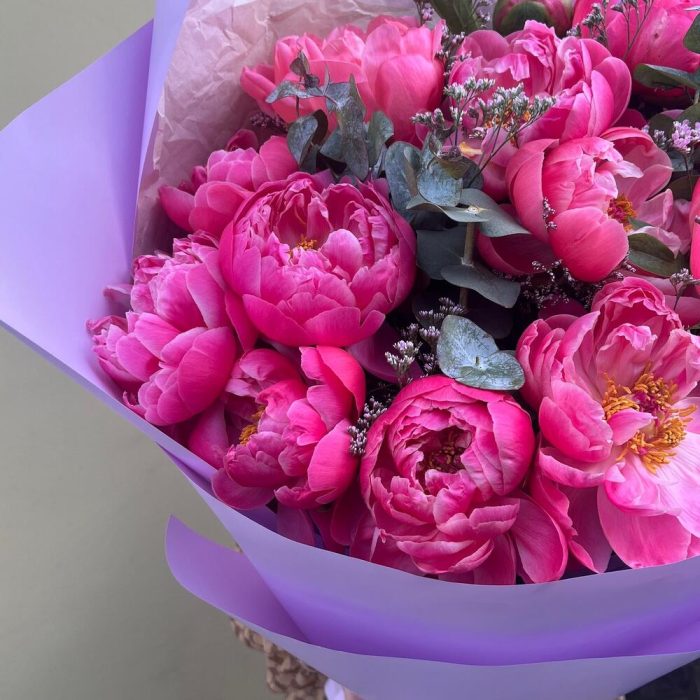 Эвкалипт – 7 шт.Лента атласная – 2 шт.Лимониум сиреневый – 4 шт.пион коралл шарм премиум – 15 шт.упаковка корейская пленка лавандовая – 1 шт.тишью крафтовое – 2 шт.