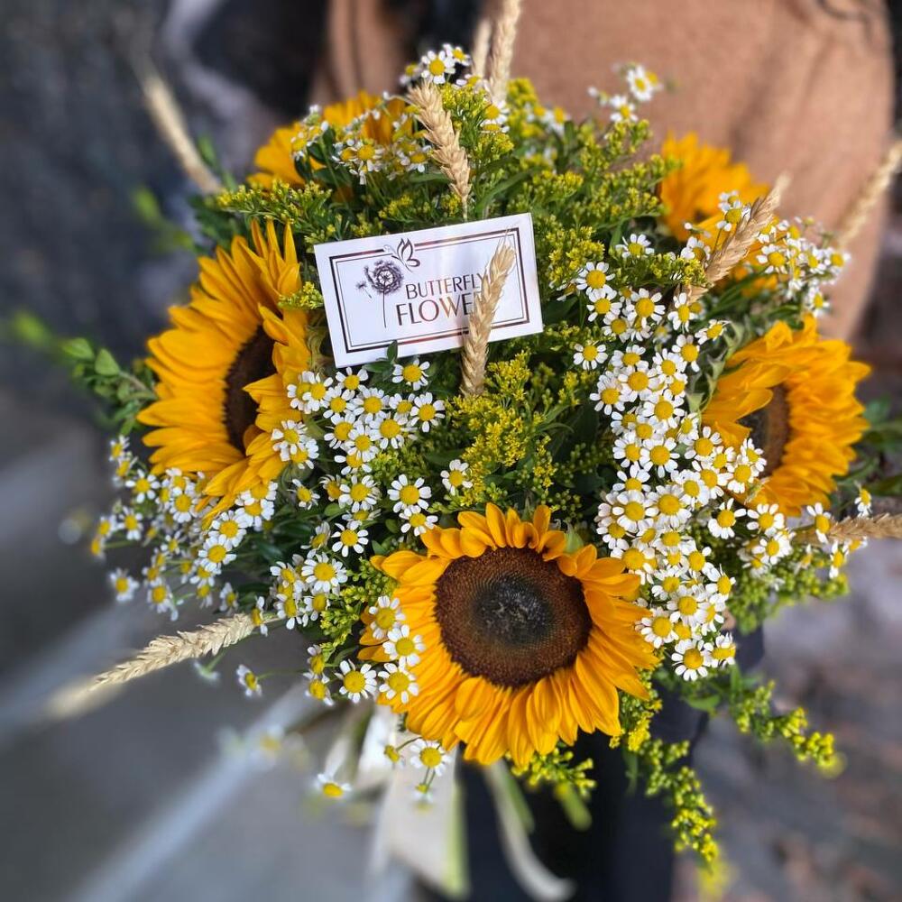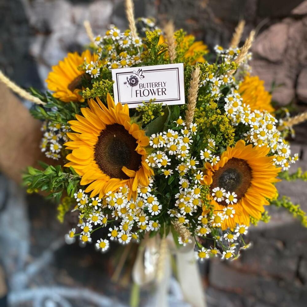 Букет из подсолнухов, матрикарии и солидаго “Рик Робертс”
