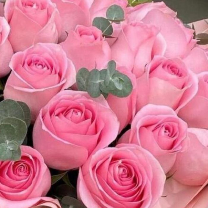 Роза розовая – 51 шт.Шляпная коробка – 1 шт.Эвкалипт – 10 шт.Открыточка с вашими пожеланиями – 1 шт.хорошее настроение – 100 шт.инструкция по уходу за цветами – 1 шт.Кризал – 1 шт.