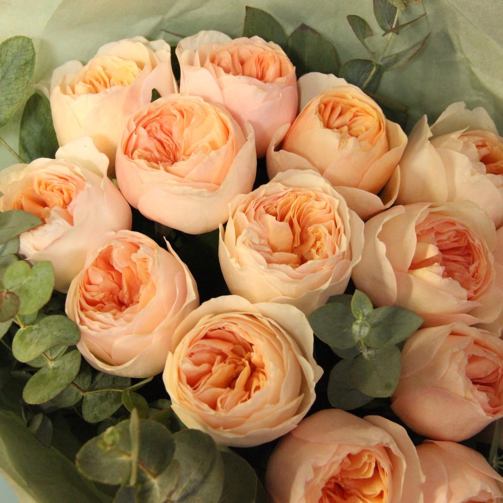 Роза пионовидная – 15 шт.Эвкалипт – 5 шт.Тишью – 4 шт.Лента атласная – 2 шт.