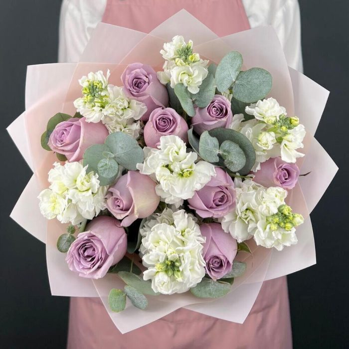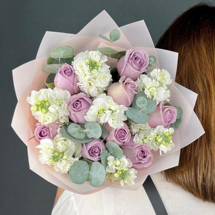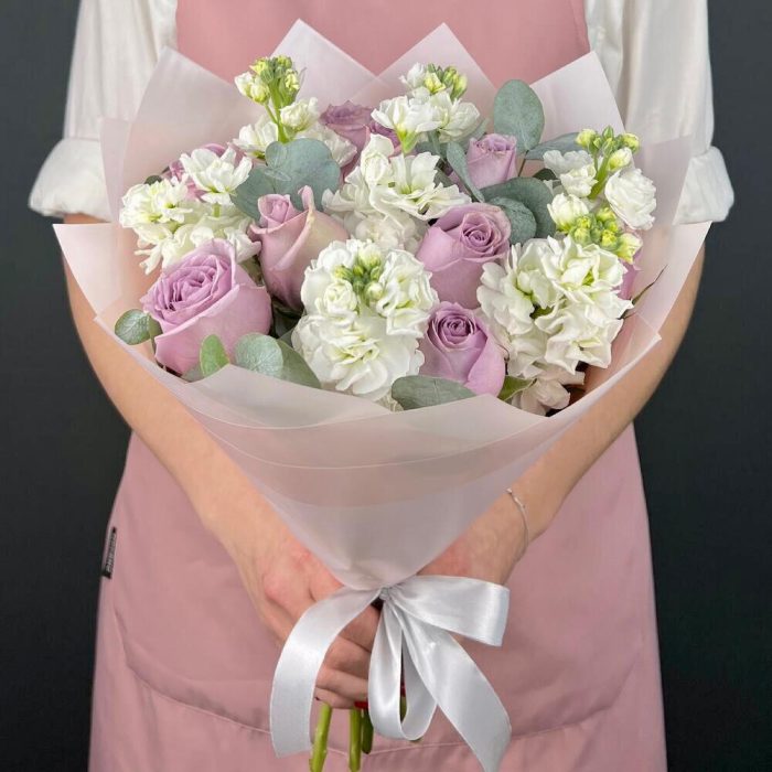 Авторский букет из фиолетовых Роз и белой Маттиолы