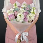 Роза одноголовая – 9 шт.Маттиола – 7 шт.Эвкалипт – 5 шт.бумага дизайнерская – 5 шт.Лента атласная – 1 шт.