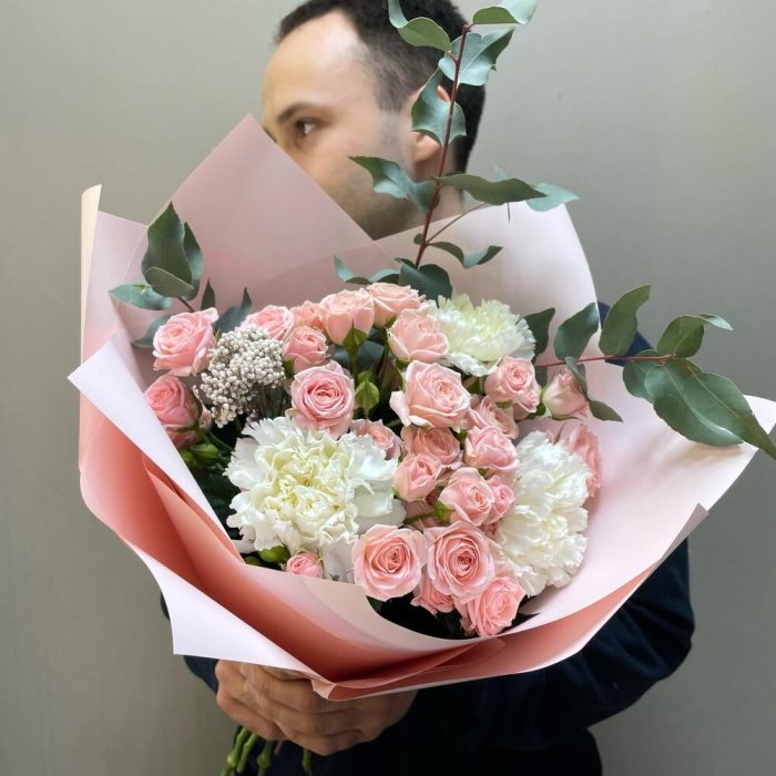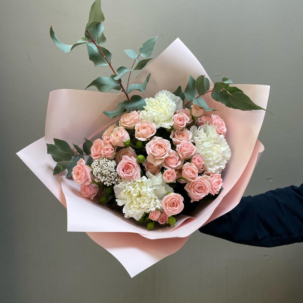 Авторский букет с кустовой розой,диантусами и эвкалиптом