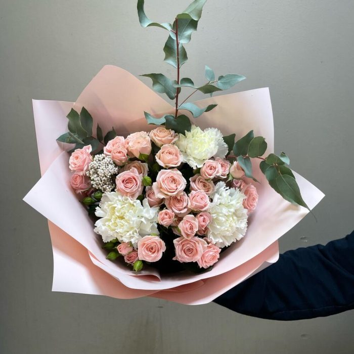 Озотамнус – 1 шт.Эвкалипт – 1 шт.Кустовая роза – 5 шт.Лента атласная – 1 шт.Диантус – 3 шт.Упаковка дизайнерская – 1 шт.