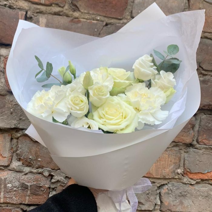 Лизиантус – 1 шт.Роза – 2 шт.Гвоздика – 3 шт.Упаковка дизайнерская – 1 шт.