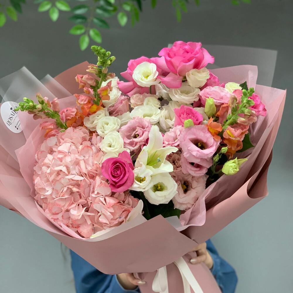 Альстромерии, Гвоздики, Кустовые розы, Лизиантусы, Розы, Хризантемы