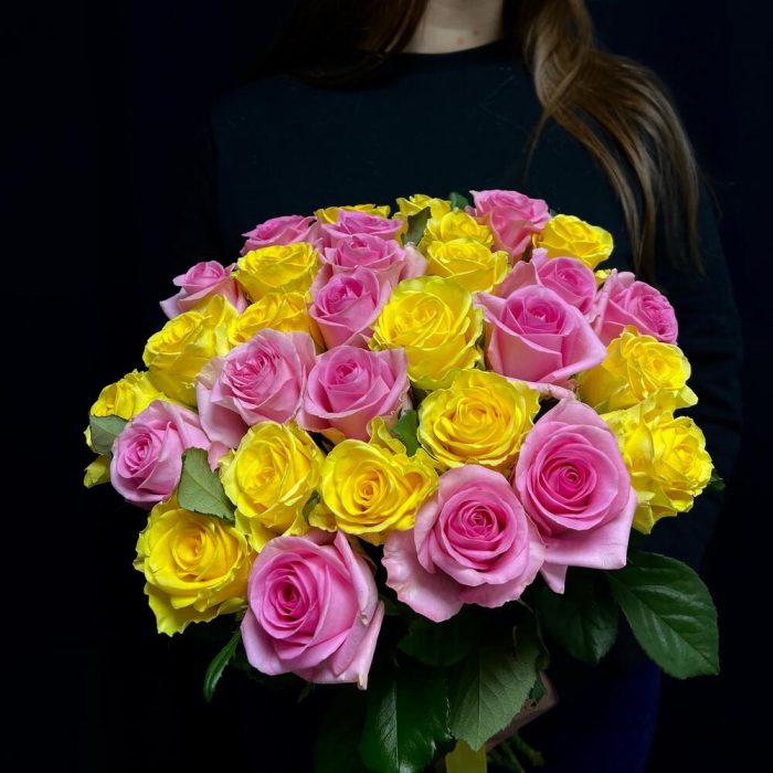 Розовая роза – 14 шт.Желтая роза – 16 шт.Лента атласная – 1 шт.