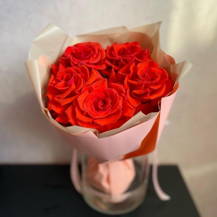 Роза – 5 шт.декоративная упаковка – 1 шт.Тишью – 1 шт.Атласная лента – 1 шт.