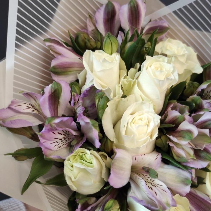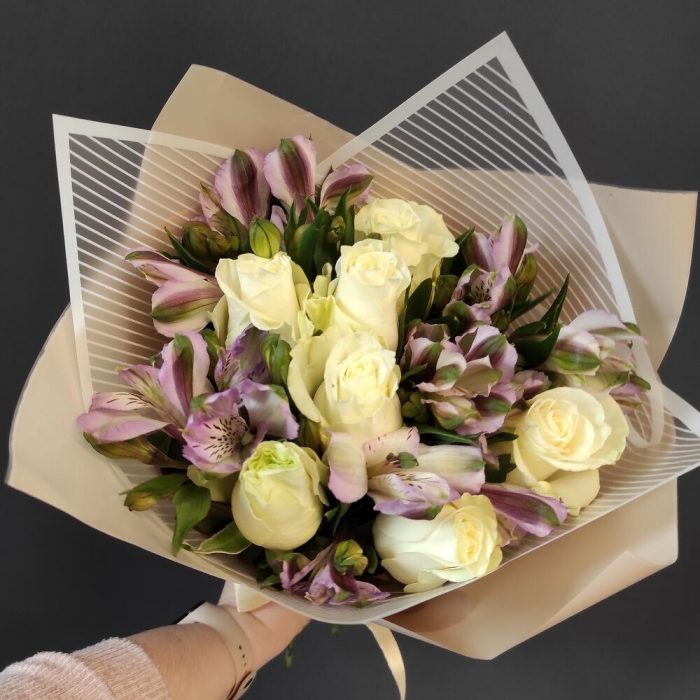 Роза – 7 шт.Альстромерия – 5 шт.Пленка матовая – 2 шт.Лента атласная – 1 шт.