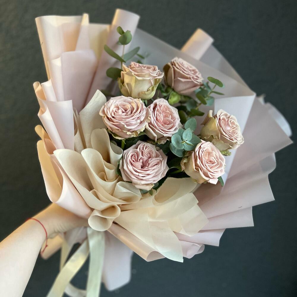 Одноголовая роза – 7 шт.Эвкалипт – 4 шт.декоративная упаковка – 1 шт.Атласная лента – 1 шт.