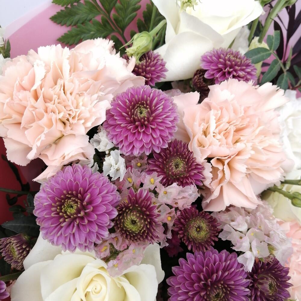 Лизиантус – 1 шт.Статица – 2 шт.Роза – 3 шт.Упаковка – 1 шт.Диантус – 3 шт.Сантини – 3 шт.Фисташка – 1 шт.