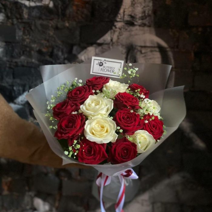 Букет из красных и белых роз с гипсофилой в стильной упаковке “Фолсен”