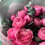 Букет из кустовой розовой пионовидной розы и эвкалипт