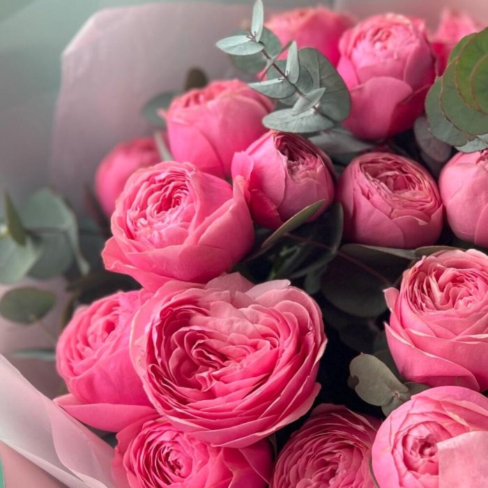 Букет из кустовой розовой пионовидной розы и эвкалипт