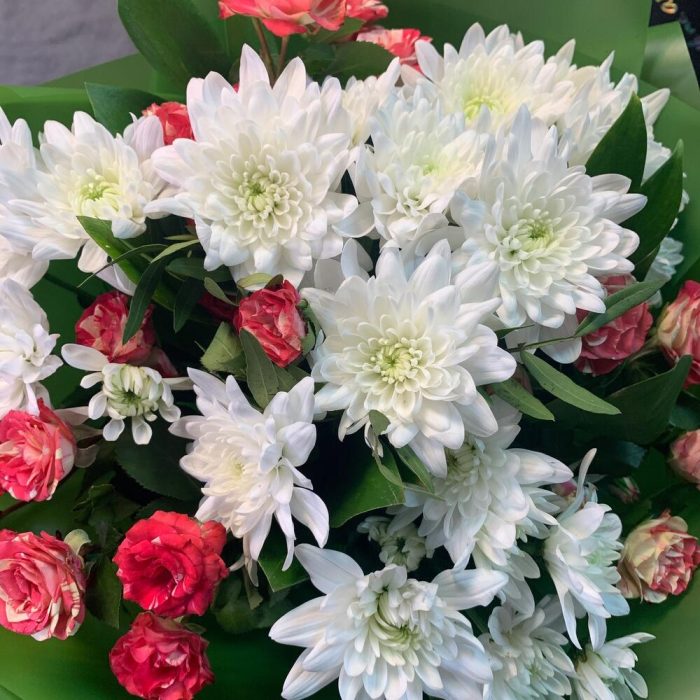 Букет из кустовых роз и кустовой хризантемы