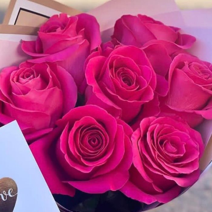 Роза Эквадор – 7 шт.Лента атласная – 1 шт.Открытка – 1 шт.Упаковка дизайнерская – 2 шт.